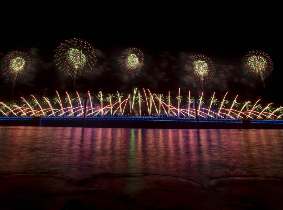 大連被稱(chēng)之為“浪漫之都”,而大連星海灣大橋則被譽(yù)為“中國最美跨海大橋”。在跨海大橋1.5公里長(cháng)的燃放范圍內,我們用3萬(wàn)發(fā)禮花,創(chuàng )造了煙花盛典的各項記錄之最,使星海灣大橋成為中國最具地標性的世界級跨年焰火觀(guān)賞地之一。盡管當天的溫度低至-6℃,也沒(méi)能阻擋現場(chǎng)180萬(wàn)觀(guān)眾的熱情,而線(xiàn)上也有超過(guò)60萬(wàn)觀(guān)眾觀(guān)看了直播。