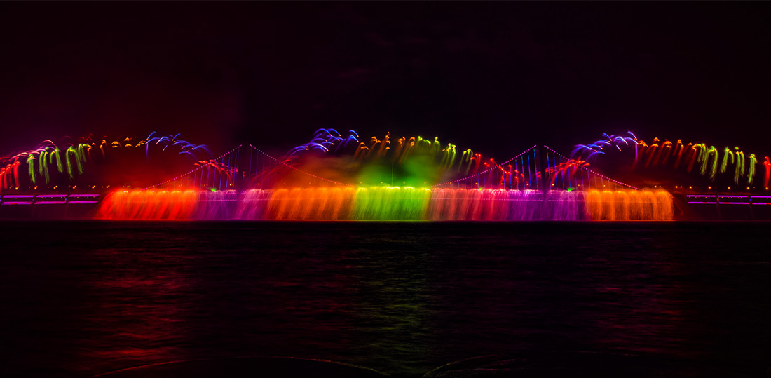 銀達利煙花設計團隊對傳統的“落葉彩虹橋”進(jìn)行技術(shù)迭代創(chuàng )新,通過(guò)精準計算,測量,建模等工序,打造了一座由75個(gè)布點(diǎn),呈現5種顏色,極具畫(huà)面感,視覺(jué)沖擊力強,寬達1000米“彩虹瀑布橋”。